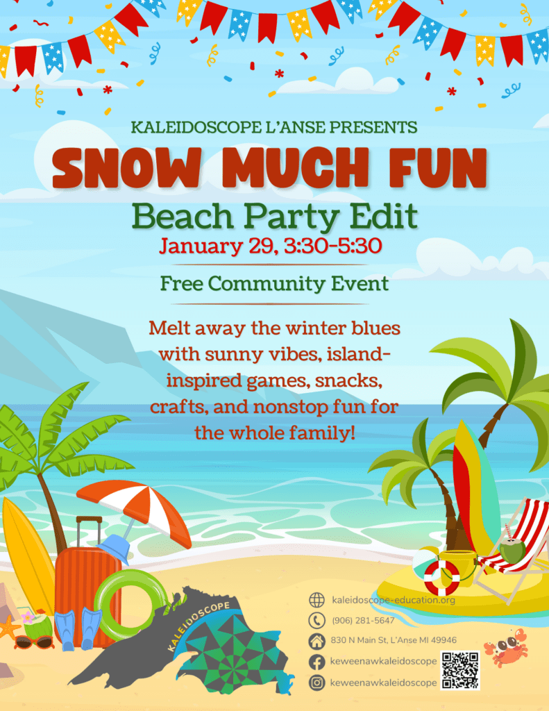 Join us for our annual winter fun bash from 3:30-5:30 at Kaleidoscope L’Anse!