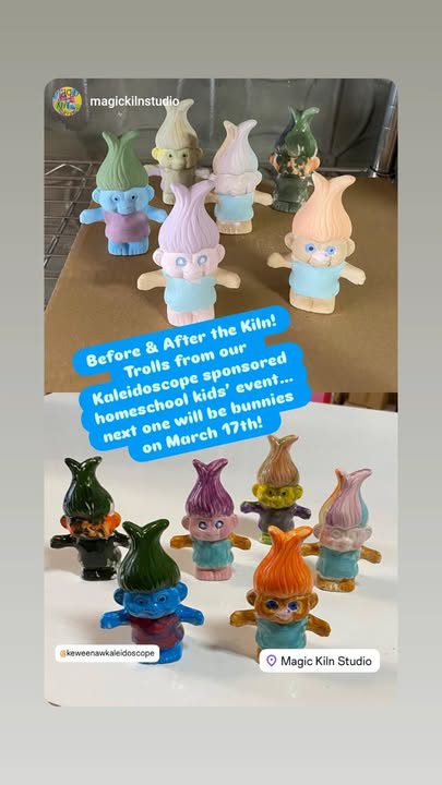 Join us one Tuesday a month at the Magic Kiln to paint a pottery project! For our first pottery painting of 2026, kids painted a troll. March features these adorable bunnies. The cost is only $5 for community members, and is free for Kaleidoscope members. You might be wondering what exactly is the Magic Kiln and where did it come from. Find out more about the studio and the person behind it below!